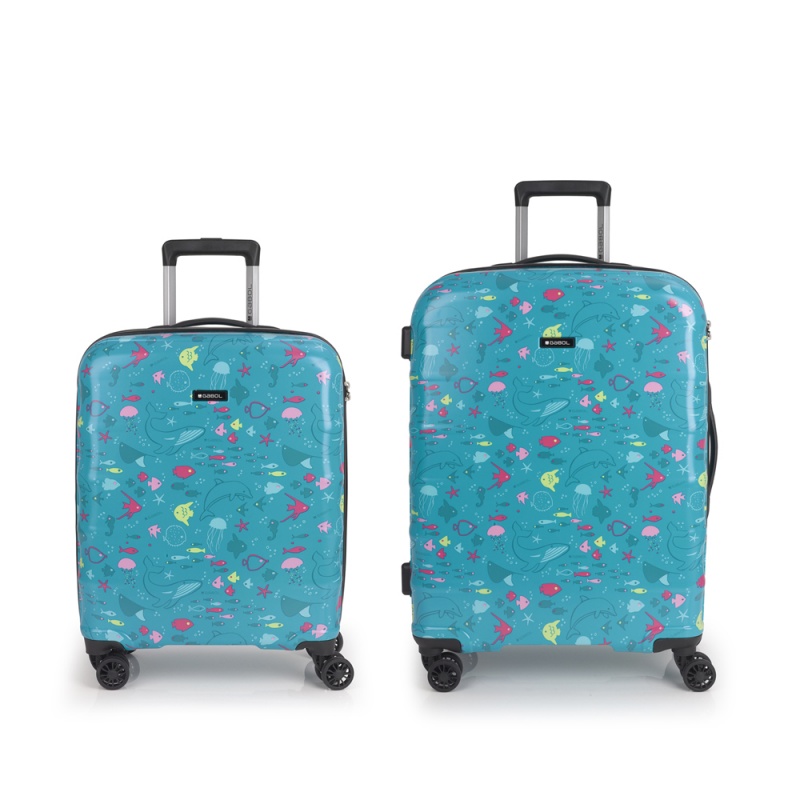 Set de maleta cabina y mediana Gabol ACQUA. Colección Acqua de Gabol, con un bonito estampado de elementos simbólicos del mar sobre un fondo turquesa. Set de una maleta de cabina con 4 ruedas dobles, con capacidad total de 37,6L, y una maleta mediana con 4 ruedas dobles con capacidad total de 65,2L. El material de fabricación es ABS y Policarbonato y su interior está compuesto por un forro de alta calidad con bolsillos. Tiene dos tamaños diferentes para tus necesidades de viaje, maleta de cabina apta como equipaje de mano. Incluye cerradura TSA.