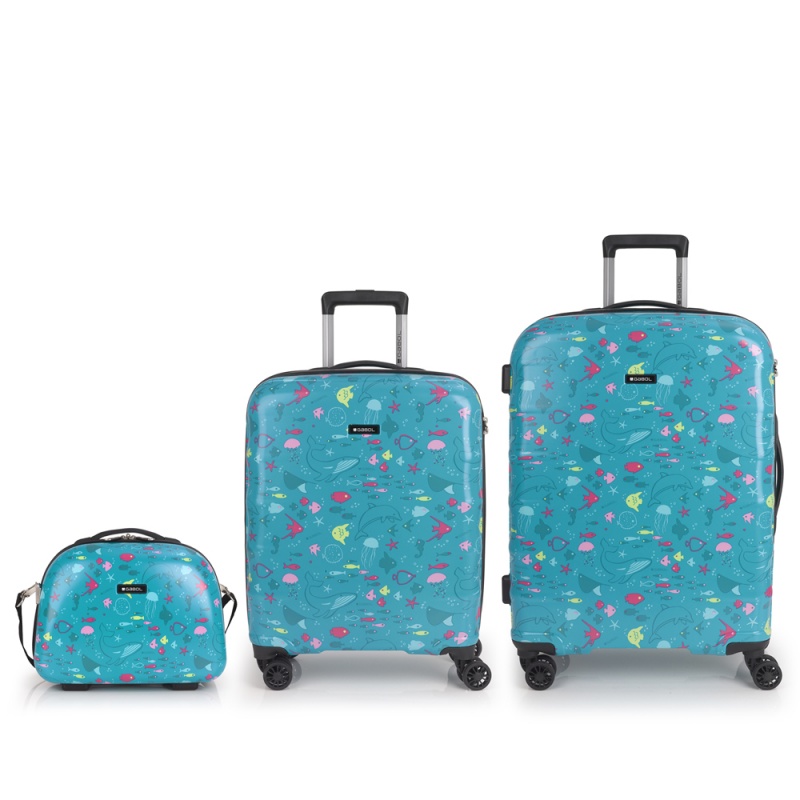 Set de maleta de cabina, mediana y neceser Gabol ACQUA. Colección Acqua de Gabol, con un bonito estampado de elementos simbólicos del mar sobre un fondo turquesa. Set de una maleta de cabina con 4 ruedas dobles, con capacidad total de 37,6L, una maleta mediana con 4 ruedas dobles con capacidad total de 65,2L y neceser. El material de fabricación es ABS y Policarbonato y su interior está compuesto por un forro de alta calidad con bolsillos. Tiene dos tamaños diferentes para tus necesidades de viaje, maleta de cabina apta como equipaje de mano. Incluye cerradura TSA. El neceser incluye bandolera y acople para la maleta que fcilita su transporte.