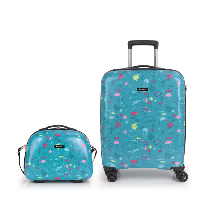 Set de maleta de cabina y neceser Gabol ACQUA. Colección Acqua de Gabol, con un bonito estampado de elementos simbólicos del mar sobre un fondo turquesa. Set de una maleta de cabina con 4 ruedas dobles, con capacidad total de 37,6L y neceser. El material de fabricación es ABS y Policarbonato y su interior está compuesto por un forro de alta calidad con bolsillos. Tiene dos tamaños diferentes para tus necesidades de viaje, maleta de cabina apta como equipaje de mano. Incluye cerradura TSA. El neceser incluye bandolera y acople para la maleta que facilita su transporte.